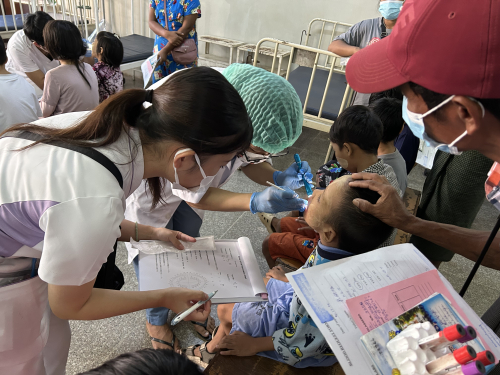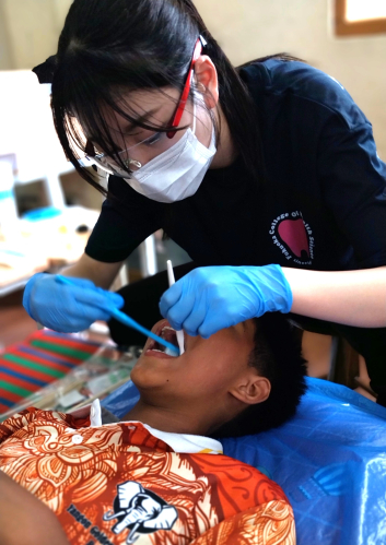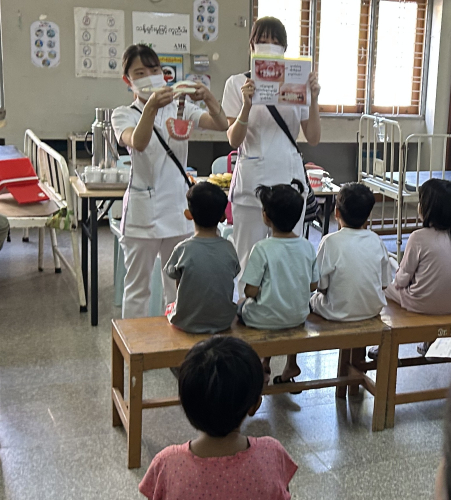 また、本学田口学長が、小児外科医として特定非営利活動法人ジャパンハートの国際医療支援を行っていることから、専攻科から選抜された学生がミャンマーに同行し、小児専門病院にて現地の歯科医師とともに、病棟の外科疾患や小児がんの患児の口腔内検診と口腔ケアの指導、養育施設での口腔内検査、集団歯科保健指導、フッ素塗布などを子供たちへ実施しています。