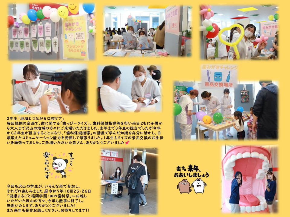 10月25日(土)・26日(日)に「2025年度健康まるごと福岡学園・田の歯科祭」を開催しました。今年も各学年それぞれの形で参加して楽しみました。例年3年生が担当だった学園企画の「地域とつながる口腔ケア」を今年から2年生が担当することになり、「歯科保健指導」の授業で学んだ知識を存分に活かし、日頃から鍛えたコミュニケーション能力を駆使して、子供から大人まで様々な来場者を対象に歯に関するクイズや歯磨き指導を行いました。2日目の午後はかなり激しい雨に見舞われましたが、両日とも無事に開催することができました。ご来場いただいた皆様、ありがとうございました。また、来年もお待ちしております。