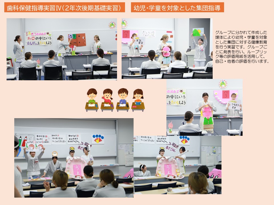 歯科衛生学科2年次「歯科保健指導実習Ⅳ」 在学生 2025.11.14 歯科衛生学科2年次「歯科保健指導実習Ⅳ」集団指導の発表会が行われました。この実習は、幼児・学童を対象とした集団に対する健康教育を作成した媒体を活用して実施できることを目標にした実習です。グループごとに分かれて、発表日に向けて毎日遅くまで媒体作成を頑張りました。発表もとても上手にできていました。3年次には、実際に小学校で集団指導を行います。