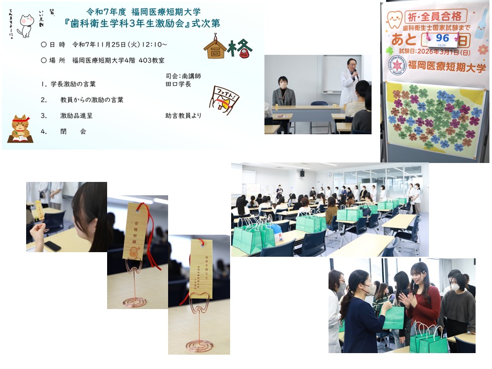 歯科衛生学科3年生激励会を行いました。 在学生 2025.11.26 11月25日火曜日に3年生の激励会を行いました。学長、学科長をはじめ、先生方からの激励の言葉をいただいた後、それぞれの助言班の先生から激励品を受け取りました。臨床実習終了後の楽しい研修旅行も終わり、これから一気に国家試験勉強モードに入ります。皆さんが積み重ねてきた努力は、必ず結果となってあらわれるはず。教職員一同、全員合格を願ってます。頑張れ3年生‼